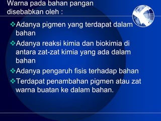 Ion-ion logam transisi-lah yang cenderung memiliki warna-warna tertentu. Zat-zat kimia berwarna ditambahkan pada soda keju mentega margarin es krim campuran bolu sereal permen sosis dan ratusan produk lain.